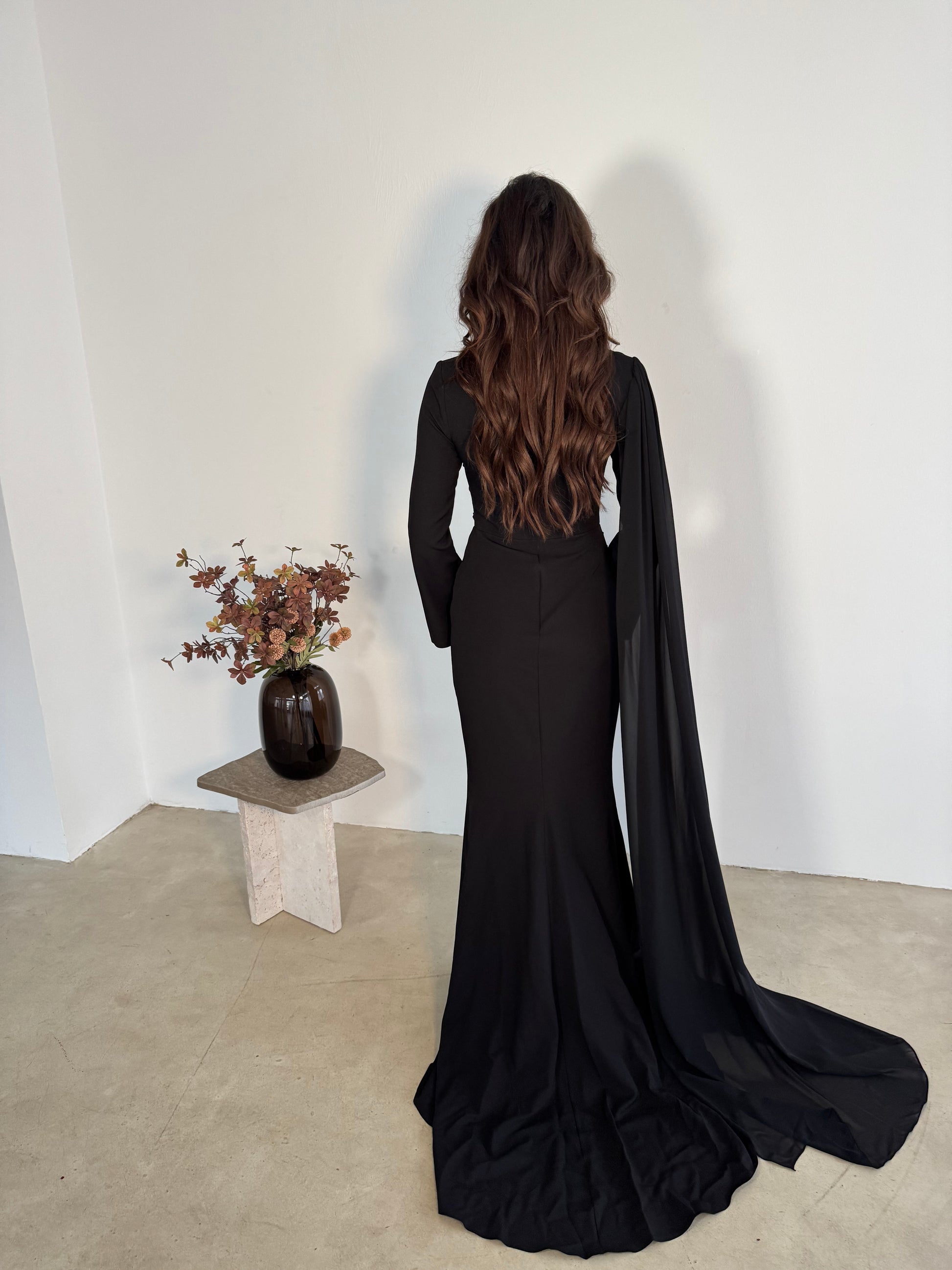 Verzaubern Sie alle in diesem Abendkleid in Schwarz mit Langarm und einem wunderschönen Schleier-Detail am Arm. Diese modeste und feminine Kleidung macht eine unglaubliche Figur und lässt Sie in jeder Situation glänzen. Erleben Sie die Stärke und Schönheit des Basma-Kleides. Bestellen Sie jetzt!