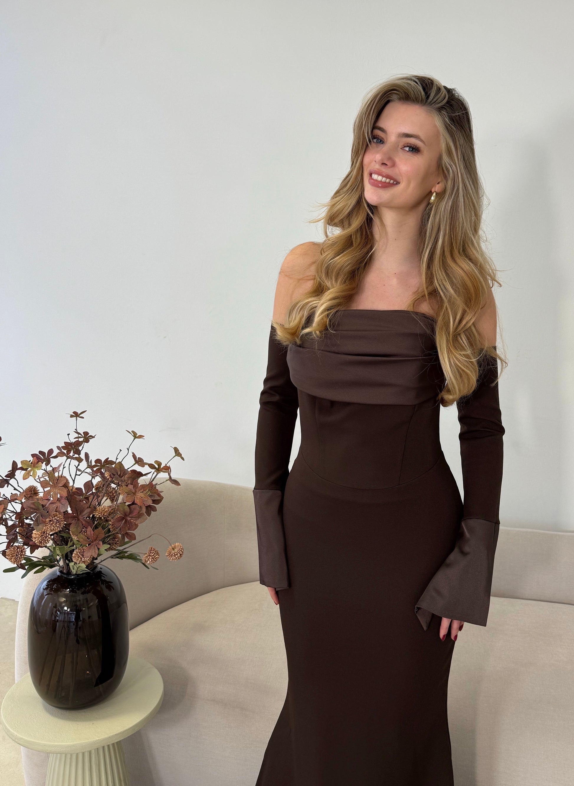 Dieses wunderschöne braune Abendkleid mit langen Ärmeln vereint zeitlose Eleganz mit femininer Ausstrahlung. Der schmeichelhafte Schnitt betont die Silhouette perfekt und zaubert eine traumhafte Figur. Das edle Design macht es zum idealen Begleiter für besondere Anlässe und sorgt für einen stilvollen, selbstbewussten Auftritt.